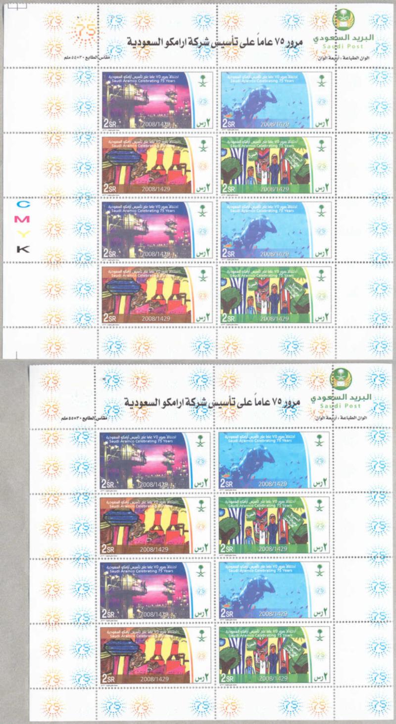 2008, 2 sheets of the 75th Anniversary of ARAMCO, one sheet NOT being cut and with left margin and CMYK and printers marks the other for comparison, LPOG never hinged, staple holes on top as issued, a fresh and desirable sheet, XF-SUP! Estimate 400€.