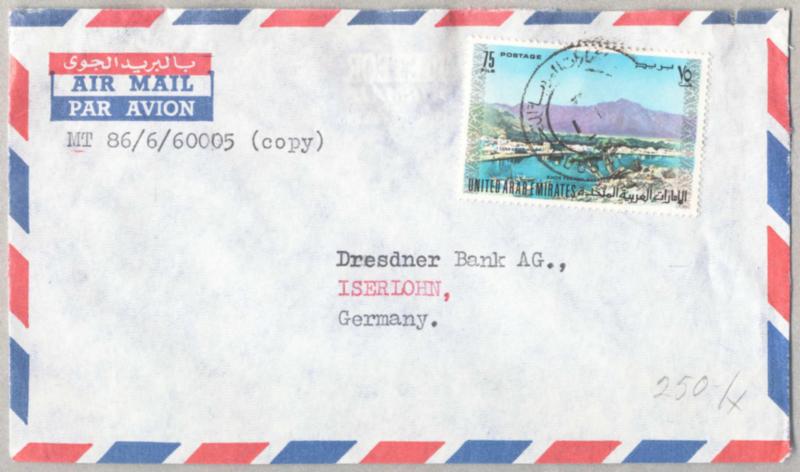 1973, 75 f., on Air Mail cover from DEIRA DUBAI/UAE to ISERLOHN/Germany, tied with DUBAI UAE 1... 7..., a fresh letter in perfect condition, XF! Estimate 150€.