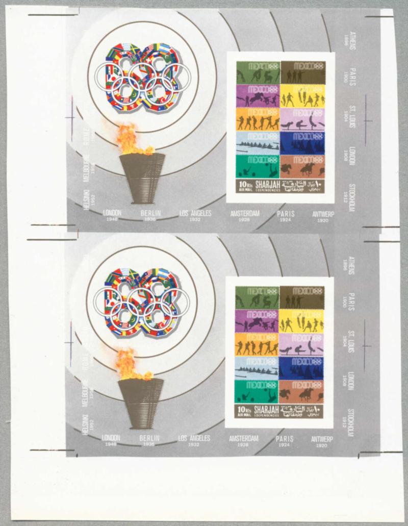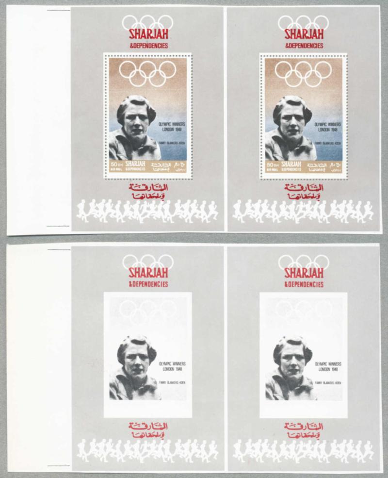 1968, 50 Dh, pair, (2), phase print without brown and blue colours and additional comparison piece, imperforate and perf., both are left margin pieces with printers lines on top left and lower left, both LPOG never hinged, very fresh and desirable, XF! Estimate 300€.