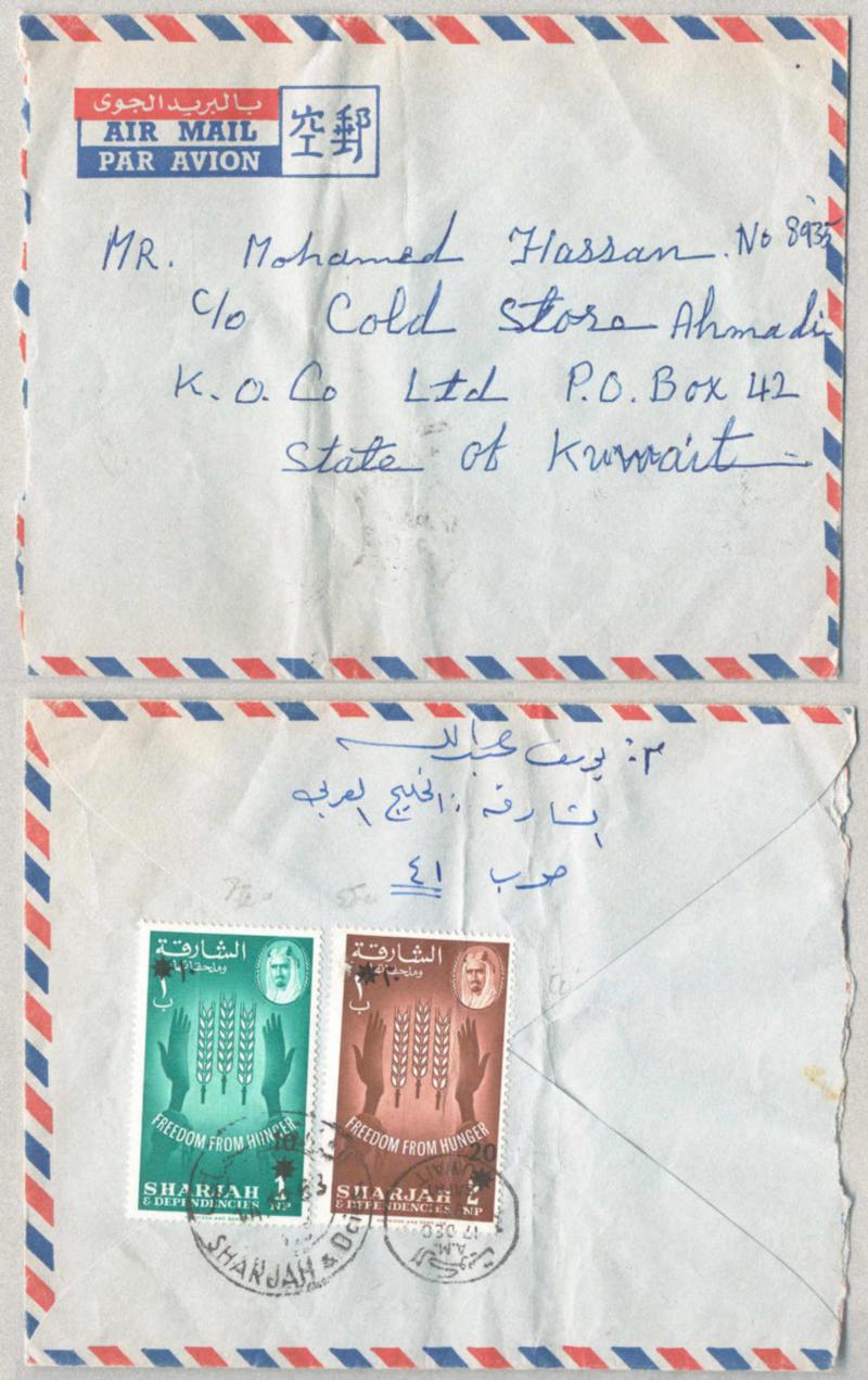 1963, 10 np on 1 np + 20 np on 2 np, on Air Mail cover from SHARJAH to KUWAIT, tied with black 14 12 63 SHARJAH & Dcies and arrival cancel 17 DEC 1963 KUWAIT, fresh and desirable letter, VF-XF! Estimate 200€.
