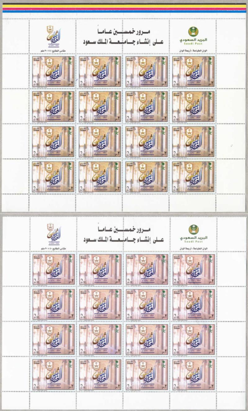 2006, 2 sheets of the 50th Anniversary of King Saud University, one sheet MISSING COLOUR and extra margin on top with printers colours, the other for comparison, LPOG never hinged, very fresh and desirable scarce variety, XF-SUP! Estimate 600€.