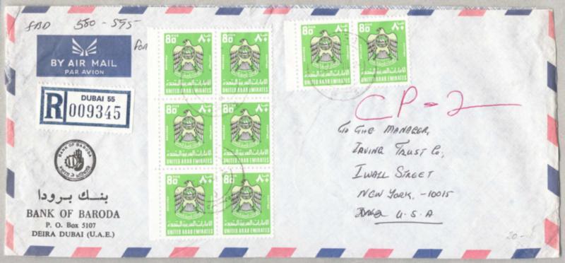 1979, 80 f. (8), light emerald, one block of (6) and one pair, from left side margin, on registered Air Mail cover from DEIRA/UAE to NEW YORK/USA, tied with DEIRA 2 10 79 on front and reverse, arrival cancel in violet on reverse NEW YORK OCT 12 1979, fresh and desirable letter in perfect condition,