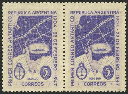 GJ.943SG, 1947 5c. First Antarctic mail, pair gummed on both sides and PRINTED ON GUM, VF quality!