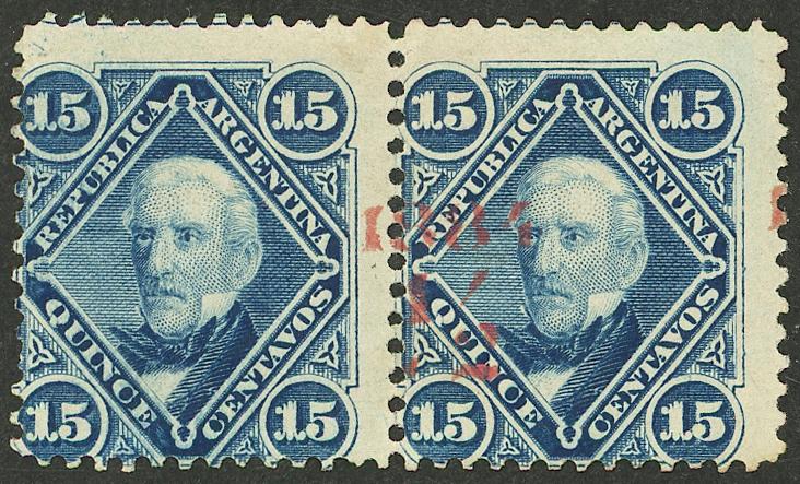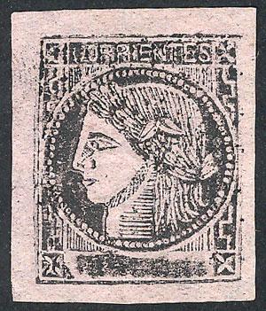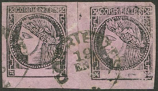 GJ.11, rose, 2 stamps (types 3 and 4) forming a re-joined pair, with datestamp of Corrientes (19/JA, without year), excellent quality!