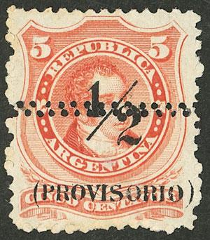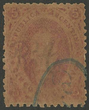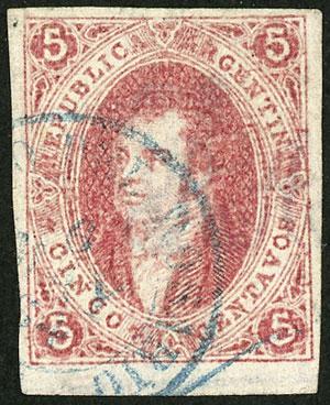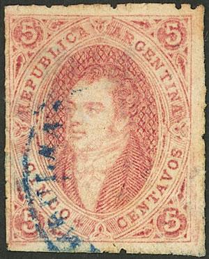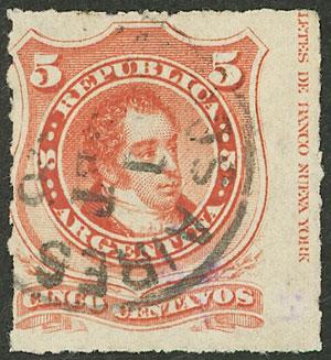 GJ.48, 1876 5c. Rivadavia rouletted, with the perforation shifted, so that the right border includes the printer imprint, excellent and rare!