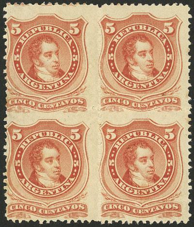 GJ.38, 1867 5c. Rivadavia with groundwork of crossed lines, block of 4, mint original gum, very fresh, very fine quality!