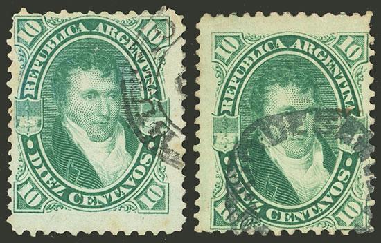 GJ.39b + 39c, 1867 10c. Belgrano, 2 stamps printed on VERTICALLY LAID PAPER, one on THICK PAPER, very fine quality!
