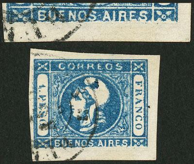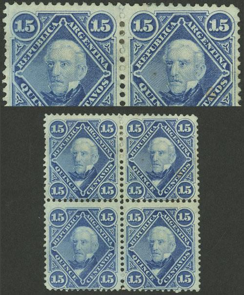 GJ.40 + 41, 1867/73 San Martín 15c. light blue with groundwork of CROSSED lines in an intermediate state between the first impressions of crossed lines (where the diagonal lines are very notable) and the final worn stage of horizontal lines. The left stamps have a groundwork of horizontal lines and