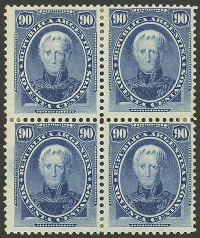 GJ.44, 1867/73 Saavedra 90c., splendid block of 4, mint with original gum, very rare!