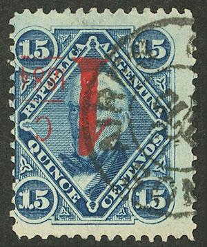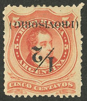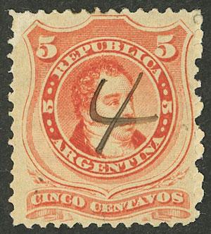 GJ.76l, 1884 provisional 4 on 5c. Rivadavia, with the "4" hand-written in pen, excellent quality, very rare and under-valued in the catalog, signed by Victor Kneitschel on back!