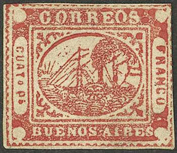 GJ.7, Cuatro Ps. red, mint without gum, excellent stamp with 3 immense margins (please note that these stamps were printed very close to each other, almost touching), signed by Victor Kneitschel and with Alberto Solari certificate