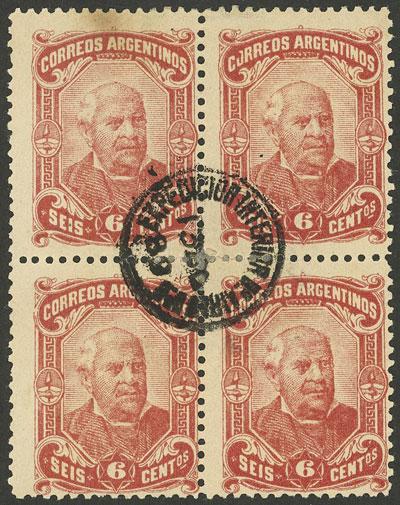 GJ.94, Sarmiento 6c., very rare used BLOCK OF 4, one of the few known blocks, excellent quality! Not catalogued by Victor Kneitschel.