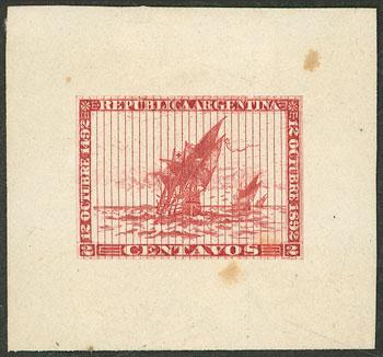 GJ.135, 1892 2c. Discovery of America, die essay in carmine, unadopted design with vertical lines, rare!