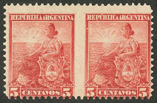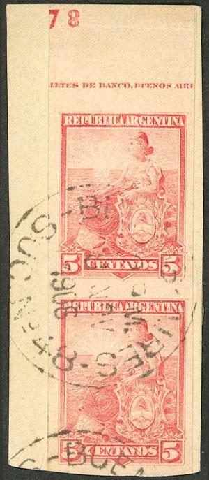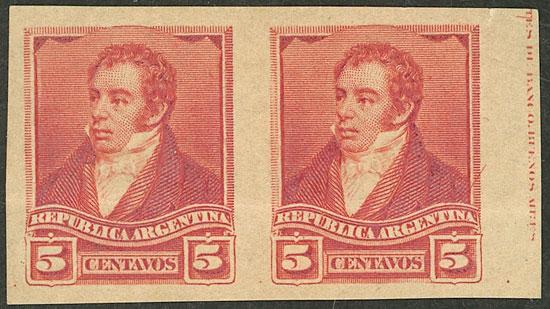 GJ.141P, 1892 5c. Rivadavia, IMPERFORATE PAIR, very fine quality!