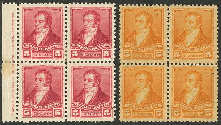 GJ.141, 1892 5c. Rivadavia, COLOR PROOFS (orange and carmine), perforated blocks of 4 printed on normal paper, the former with gum, very fine quality, rare!