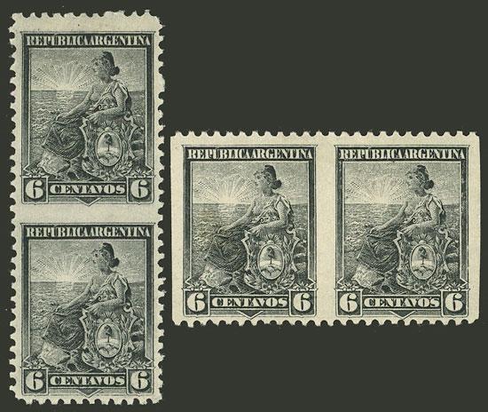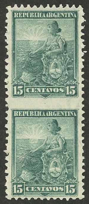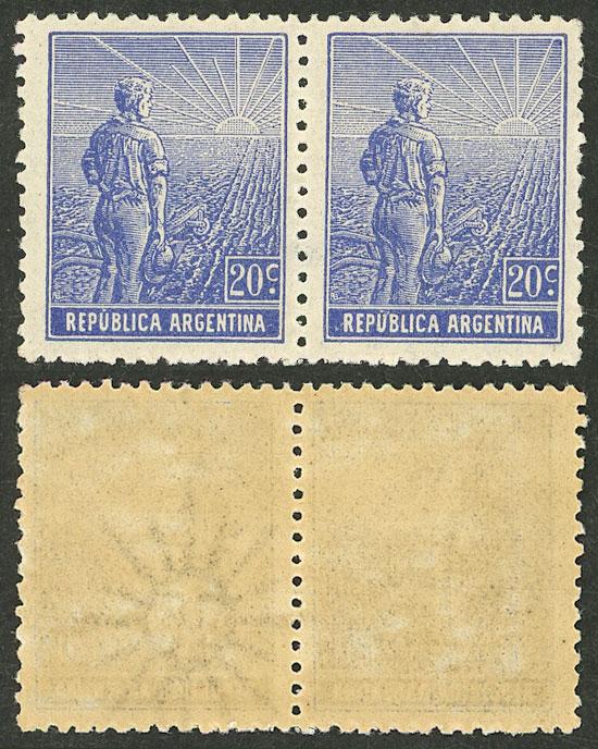 GJ.888, 20c. Bull, chalky paper, pair with VERY SHIFTED PERFORATION (the bottom stamp WITHOUT "REPUBLICA ARGENTINA"), excellent quality!