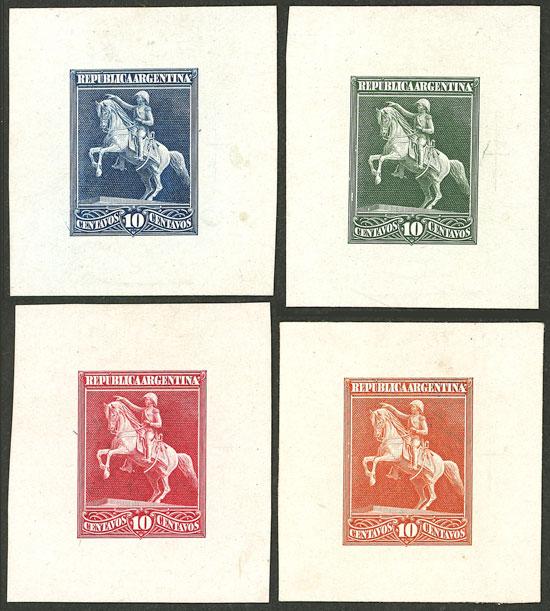 1910 Centenary, 10c. Monument to San Martín, die essays of a design present by Compañía Sudamericana de Billetes de Banco and unadopted, 4 different colors, excellent lot!