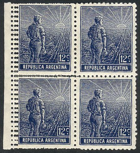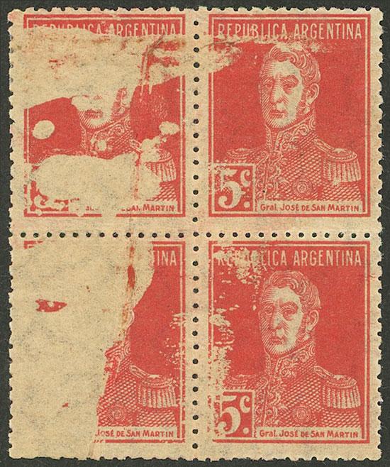 GJ.567, 1923 5c. San Martín with period, fantastic block of 4 with notable unprinted areas in the 4 examples, excellent quality!