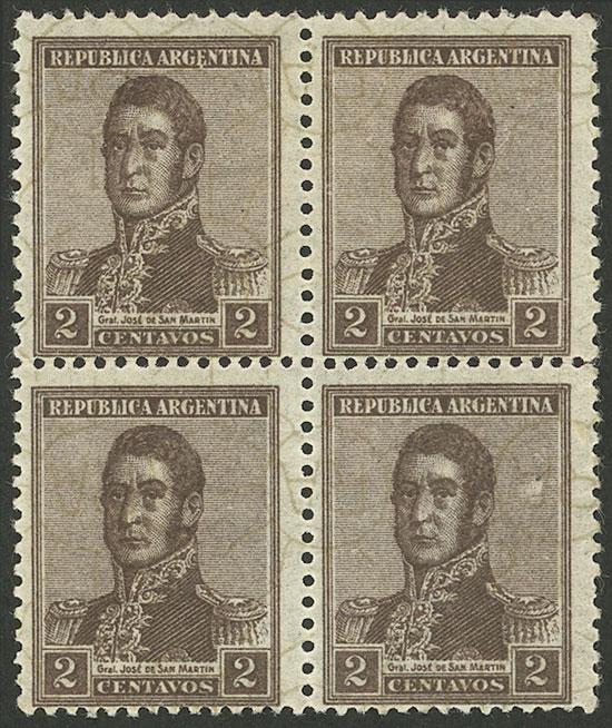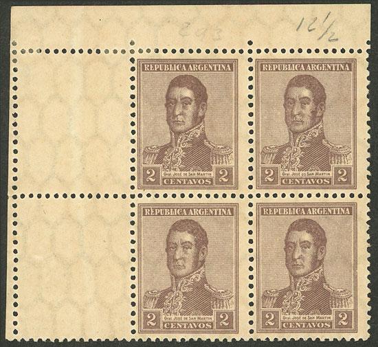 GJ.425CZ, 1917 2c. San Martín with vertical honeycomb watermark and perforation 13½ x 12½, block of 4 WITH LEFT LABELS, excellent quality, rare! NOTE: It will be included in the next edition of the GJ catalog.