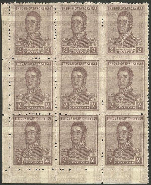 GJ.444a, 1917 2c. San Martín with DOUBLE IMPRESSION variety, fantastic MNH block of 9 (+50%), superb and spectacular!