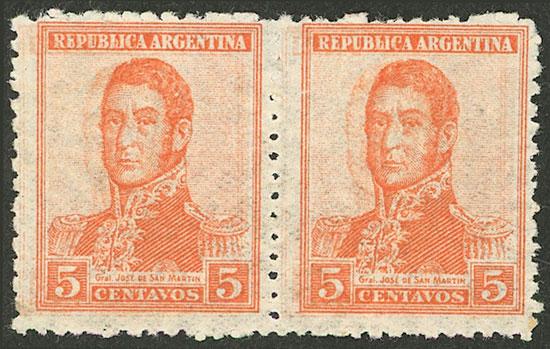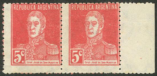GJ.629d, 1927 5c. San Martín with AP watermark, pair WITH AND WITHOUT PERIOD after the value. The stamp with period also has an additional variety "period after the 5", excellent and rare!