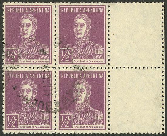 GJ.594CD, 1924 ½c. San Martín, block of 4 WITH RIGHT LABELS, used, excellent quality, very rare! (it is almost impossible to find these stamps with labels in used condition, and much more in a block!)