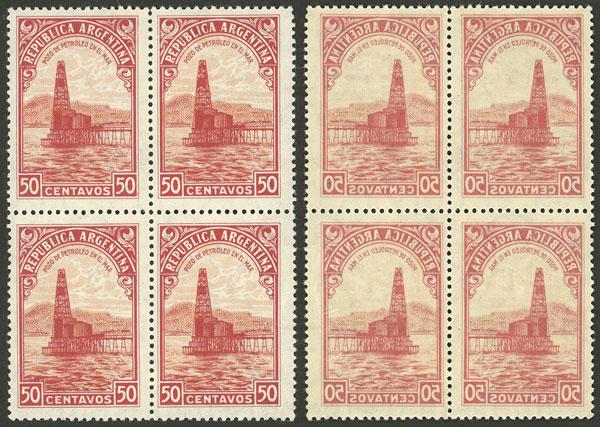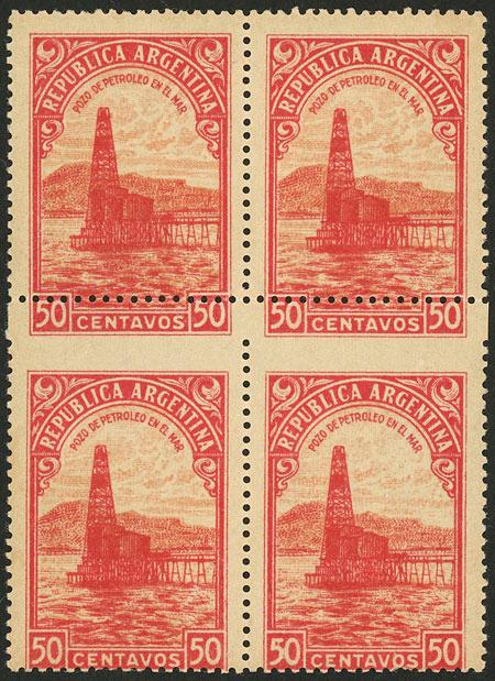 GJ.811, 50c. Petroleum well at sea, block of 4 with the central perforation very shifted, the top stamps without face value, excellent!