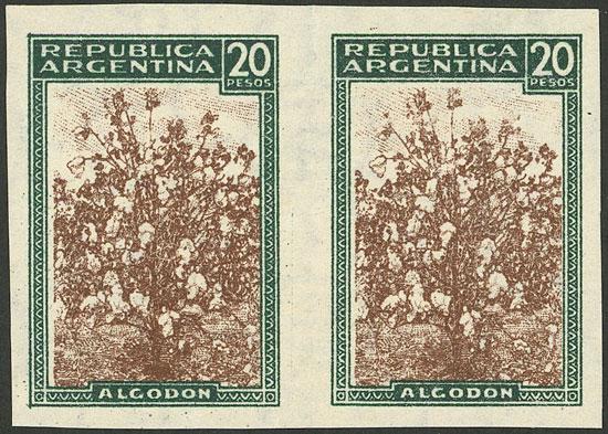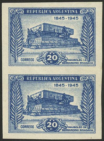 GJ.925P, 1945 20c. Mausoleum of Rivadavia, IMPERFORATE PAIR, mint without gum, very rare!