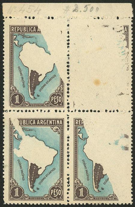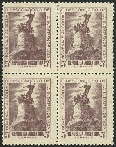 GJ.925CA, 1945 20c. Mausoleum of Rivadavia, block of 4 with top labels, COMPLETE OFFSET IMPRESSION ON BACK, excellent!