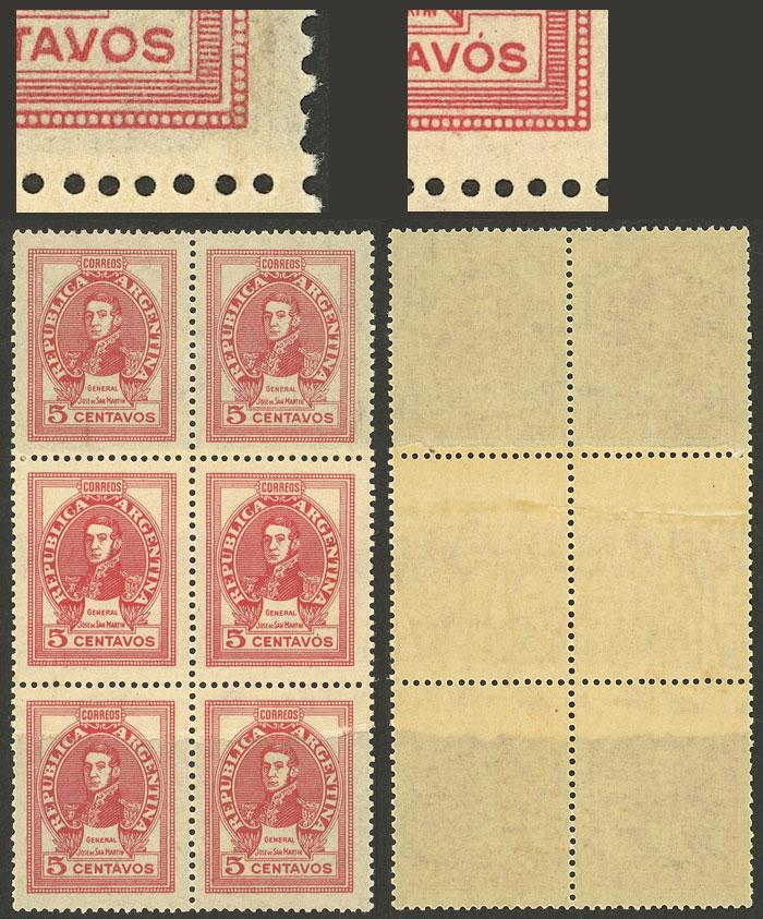 GJ.878, 5c. San Martín impreso on national unsurfaced paper, block of 6 with end-of-roll double paper var. Also 2 stamps with additional varieties: "V with dot" and "O with accent", excellent!