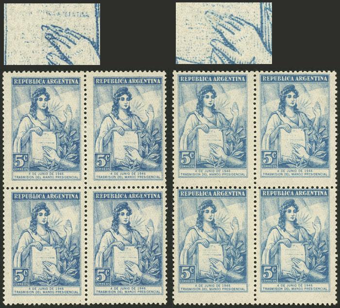 GJ.928c, 1946 Transmission of presidential power, 2 blocks of 4, each one with one stamp of position 55 (plate B) BEFORE AND AFTER the retouch in the fingers, very fine quality!
