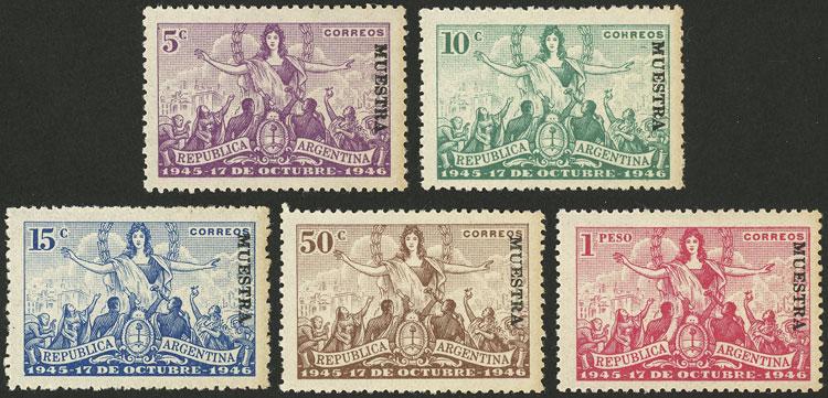 GJ.935/39, 1946 Anniversary of October 17 Movement (Peronism), the set of 5 values with MUESTRA overprint, very fine quality, rare!