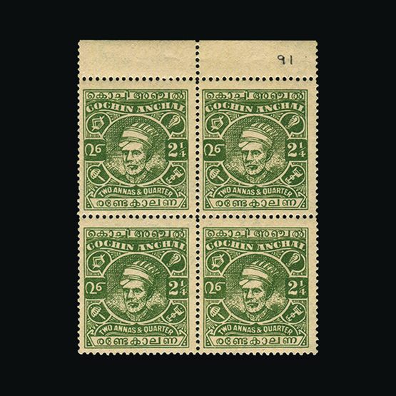 1943 Maharaja Kerala Varma II 2¼a yellow green perf 13x13½ in top marginal u.m. block of 4, minor pressure marks on gum of top two otherwise very fine {UM} [US5] (Start Price / Minimum Bid) = £35.20)