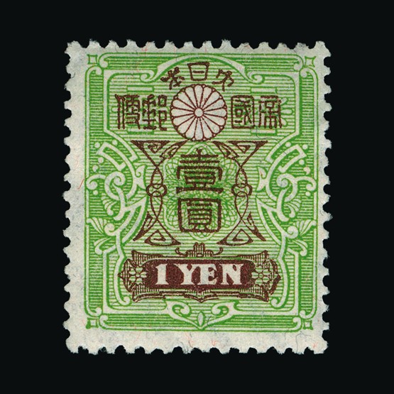 1914 1y pale green & chocolate 'Taisho' issue with wmk perf 13 x 13½, a fine mint copy. (SG 182e, Cat £225) {MH} [US7] (Start Price / Minimum Bid) = £42.40)