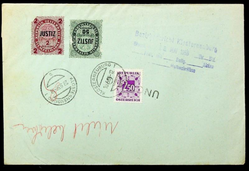 Austria 1958 "JUSTIZ" ovpt 2v on cover w/ return receipt from & to Klosterneuburg w/ Postage Due 2.50s