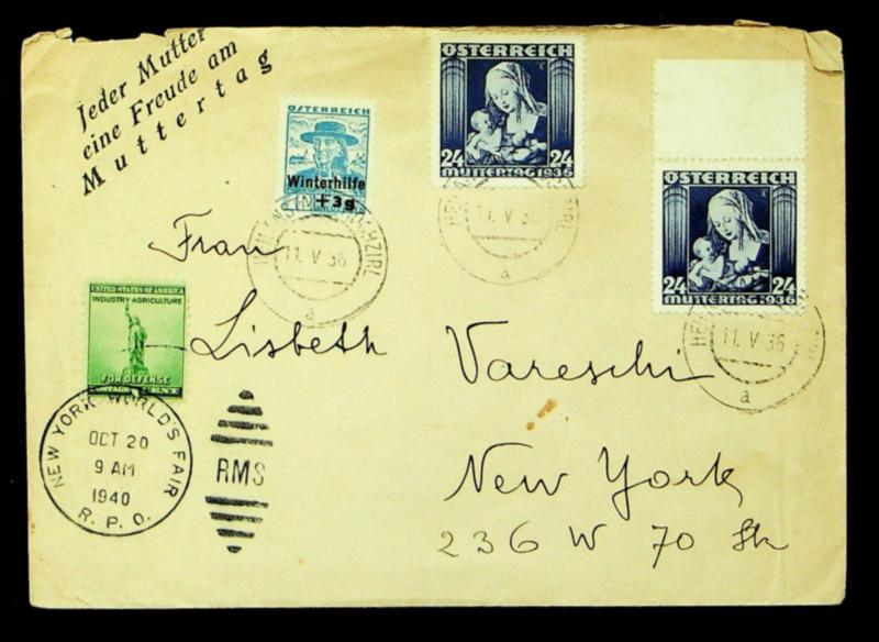 Austria 1940 WWII Winter relief s/c+ Mother's Day 2v on cover w/ "RMS" cachet to New York USA w/ Postage Due 1c