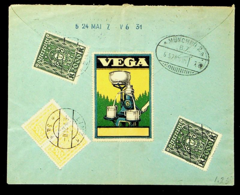 Austria 1924 Regd Express cover franked 4v at back w/ "VEGA" label from Linz to Munich Germany