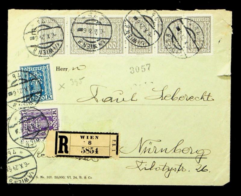 Austria 1924 8v on Regd cover from Wien to Nurnberg Germany