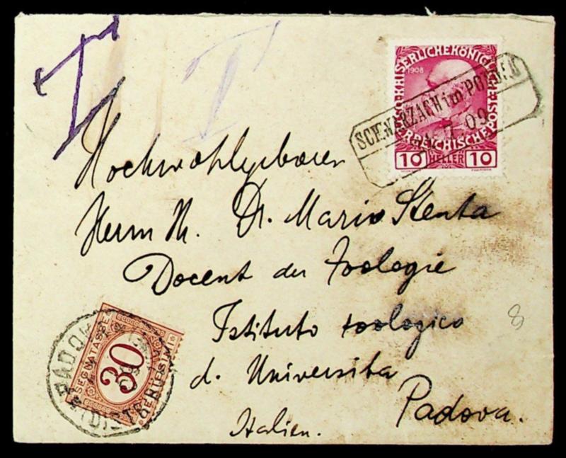 Austria 1909 10h+30c, segnatasse Taxed postage due cover from Schwarzach to Padova Italy