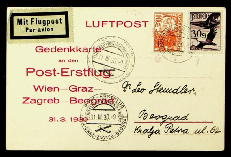 Austria 1930 2v airmail Vienna-Graz-Zagreb-Beograd FFC to Beograd Serbia