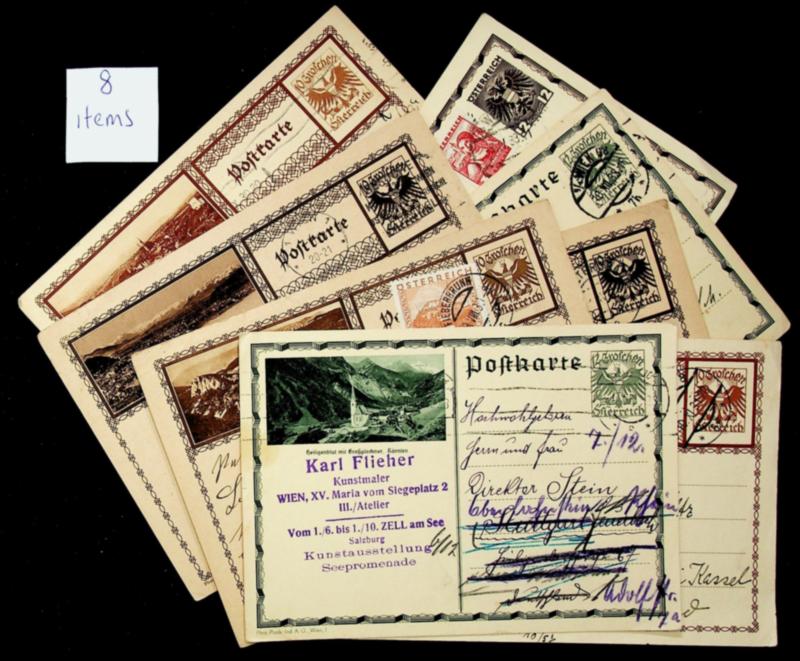 Austria set of 8 variously illustrated Coat of Arms postcards, 3 uprated to Germany/ Czechoslovakia, 1 redirected