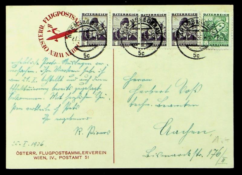 Austria 1936 5v on postcard w/ airmail cachet from Krems a/d Donau to Aachen Germany