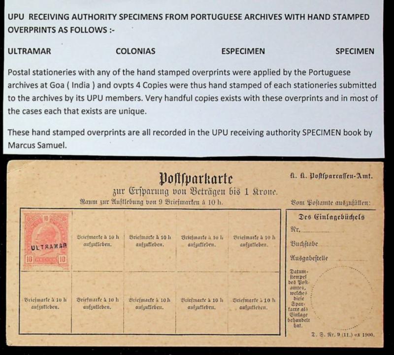 Austria 10h unused postal savings card Proof h/s “ULTRAMAR” by UPU Portuguese Receiving authorities at Goa India. Very rare