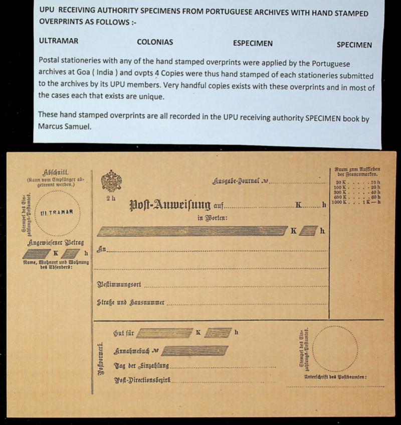 Austria 2h unused money order card Proof h/s “ULTRAMAR” by UPU Portuguese Receiving authorities at Goa India. Very rare