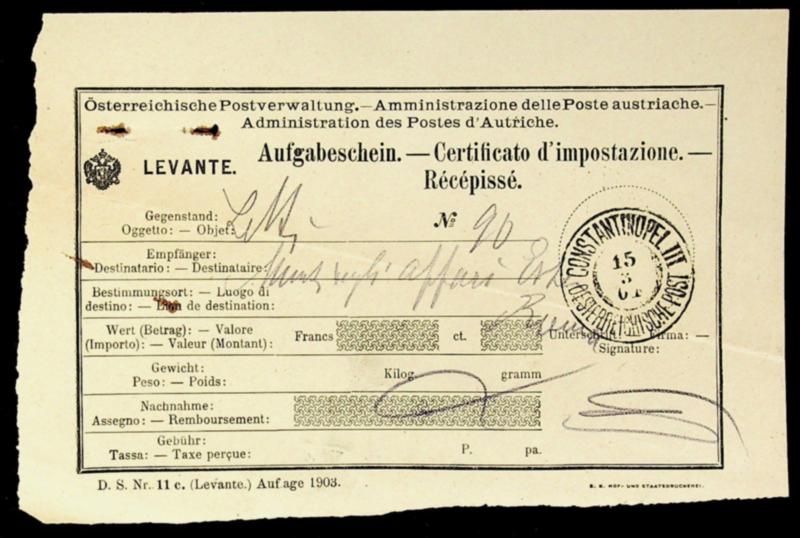 Austria Levant Certificate of posting Receipt issued at Constantinople (Turkey)
