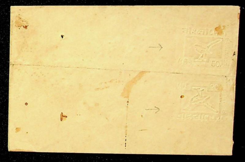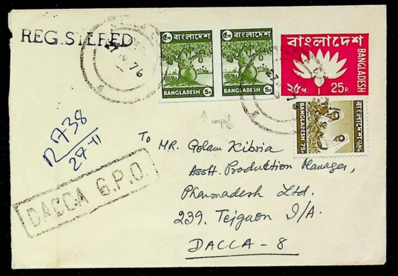 Bangladesh 1976 Lotus 25p Regd envelope uprated w/ 5p imperf pair+ 75p+ 20p sent within Dacca