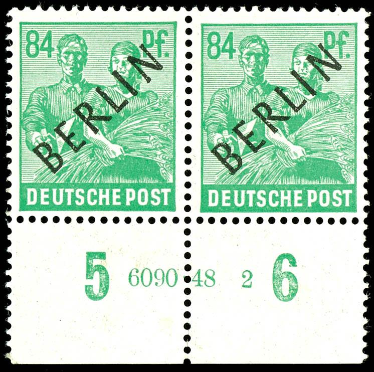 84 pfennigs black overprint, horizontal lower margin pair with house order number 6090.48 2, mint never hinged, very fine, expertized Schlegel BPP, Michel 250.- (16HAN) 84 Pfennig Schwarzaufdruck, waagerechtes Unterrandpaar mit Hausauftragsnummer 6090.48 2, postfrisch, tadellose Erhaltung, geprü