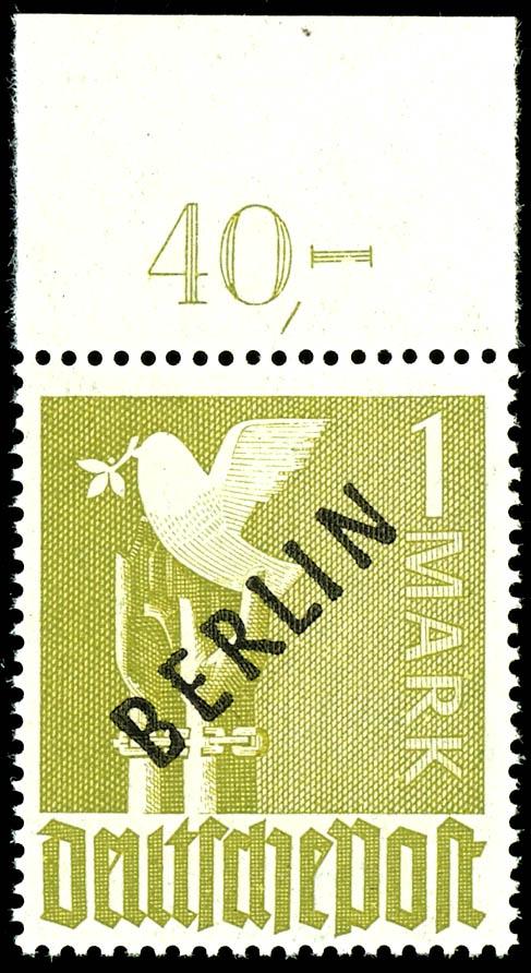 1 Mark black overprint, upper margin of plate pressure piece not perforated throughout, mint never hinged, very fine, unsigned (17PORndgz) 1 Mark Schwarzaufdruck, Plattendruckoberrandstück ndgz., postfrisch, tadellose Erhaltung, unsigniert
