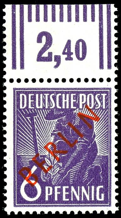 80 pfennigs red overprint, upper margin of plate pressure piece not perforated throughout, mint never hinged, very fine, expertized Schlegel BPP, Michel 500.- (32PORndgz) 80 Pfennig Rotaufdruck, Plattendruckoberrandstück ndgz., postfrisch, tadellose Erhaltung, geprüft Schlegel BPP, Mi. 500.-