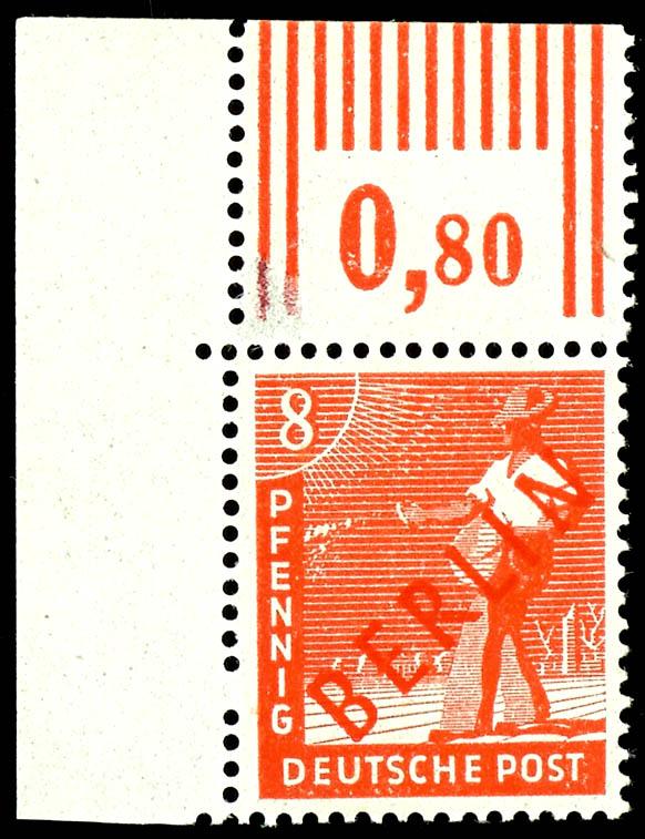 8 pfennigs red overprint, rotary printing, corner margin piece top left (field 1), mint never hinged, unfolded, very fine, unsigned, Michel 250.- plus plus (23WOR) 8 Pfennig Rotaufdruck, Walzendruck, Eckrandstück oben links (Feld 1), postfrisch, ungefaltet, tadellose Erhaltung, unsigniert, Mi. 25